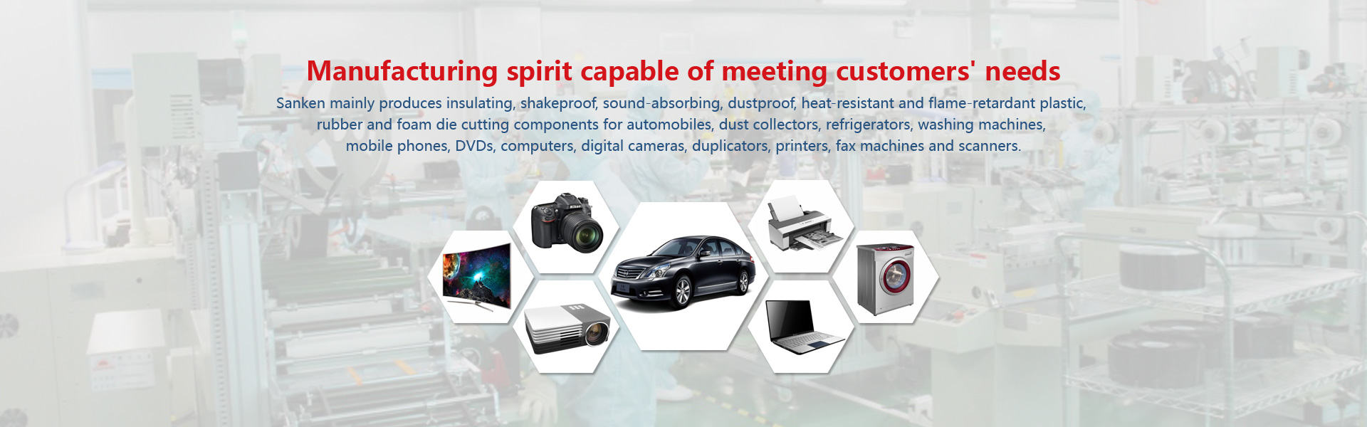 Sanken mainly produces insulating, shakeproof, sound-absorbing, dustproof, heat-resistant and flame-retardant plastic, rubber and foam die cutting components for automobiles, dust collectors, refrigerators, washing machines, mobile phones, DVDs, computers, digital cameras, duplicators, printers, fax machines and scanners.