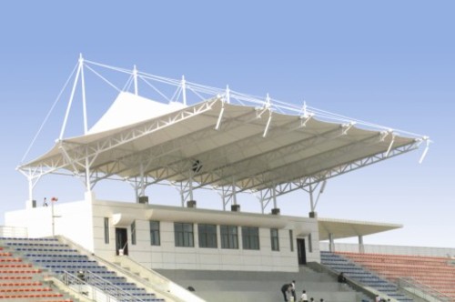 第二點,膜結構看台頂部封闆採(cǎi)用茶色(顔色可挑選)陽光闆封頂,與車(chē)棚整體骨架用壓條鉚接固定,耐酸堿腐蝕,有足夠強度對棚内車(chē)輛起到保護作用;